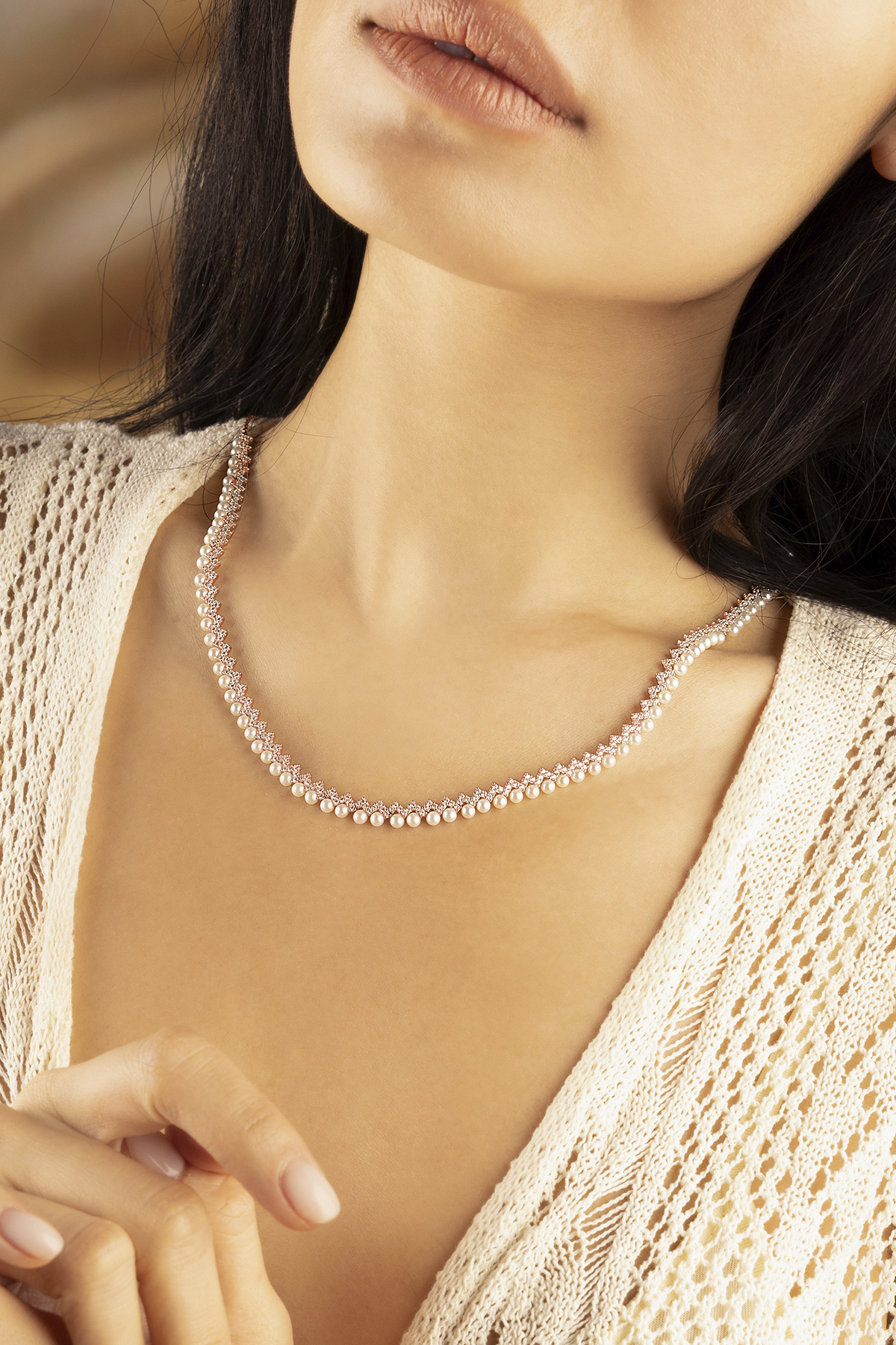 Necklaces APM Monaco, rose gold adjustable chain with rectangular links, some pavé-set diamonds.Necklace with rose gold beads worn by a model in an olive green outfit.
