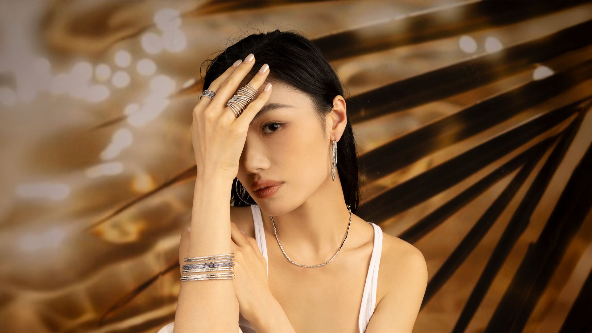 Earrings APM Monaco: five-hoop silver pavé-set crystal earrings with stacked hoops.Close-up of a person wearing five-hoop silver earrings from APM MONACO with a blurred background