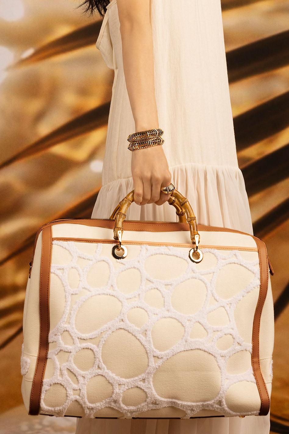APM MONACO textured sparkling tote bag on a white backgroundAPM MONACO sparkling tote bag worn on model with APM jewelry