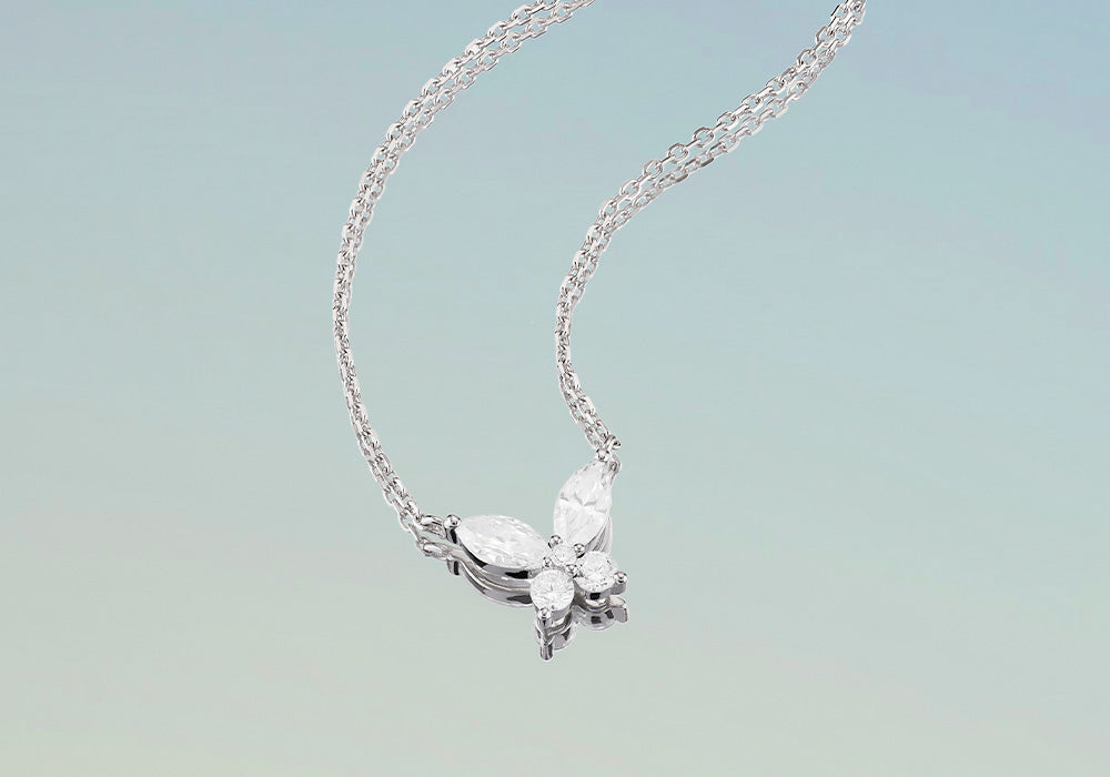 Necklaces APM Monaco. White gold butterfly necklace with white cubic zirconia on a silver chain; butterfly pendant and APM clasp.APM MONACO butterfly necklace in silver worn on model
