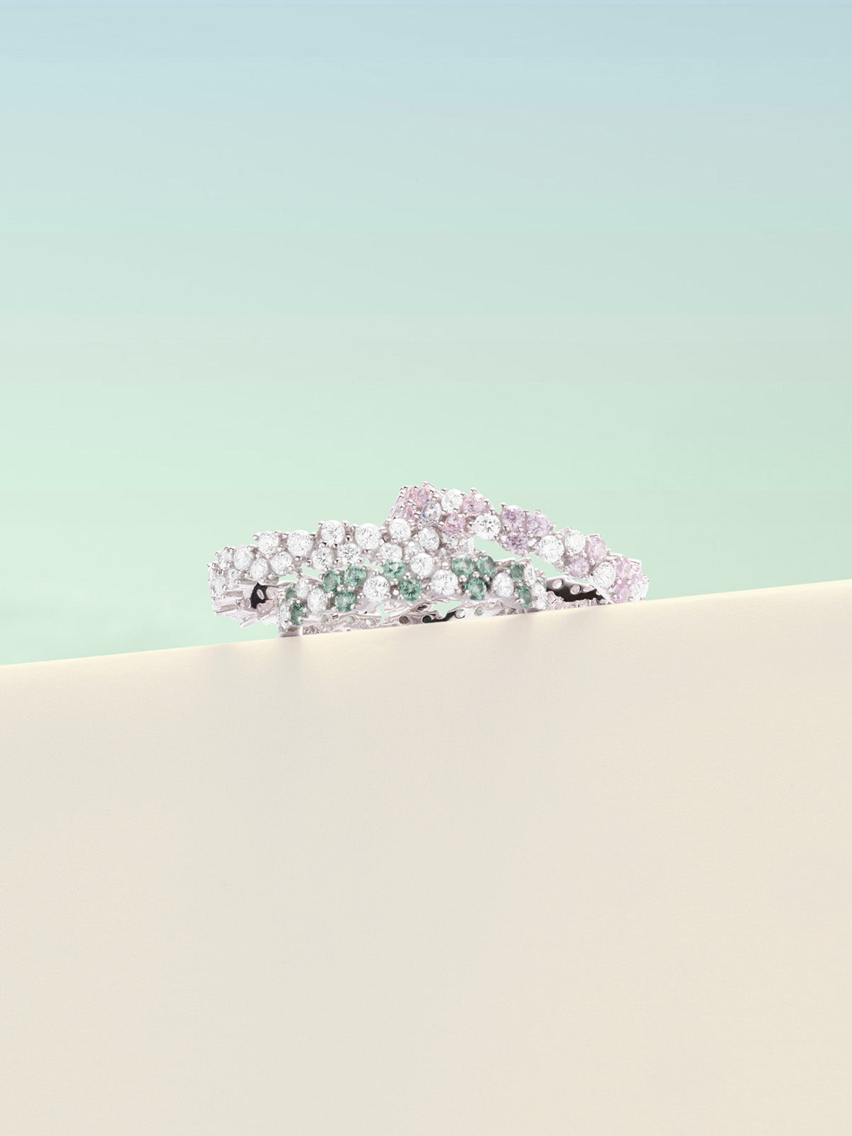 Bracelets APM Monaco. pastel-green stones set in a silver pavé bracelet.APM MONACO pastel green spark bracelet worn on model's hand