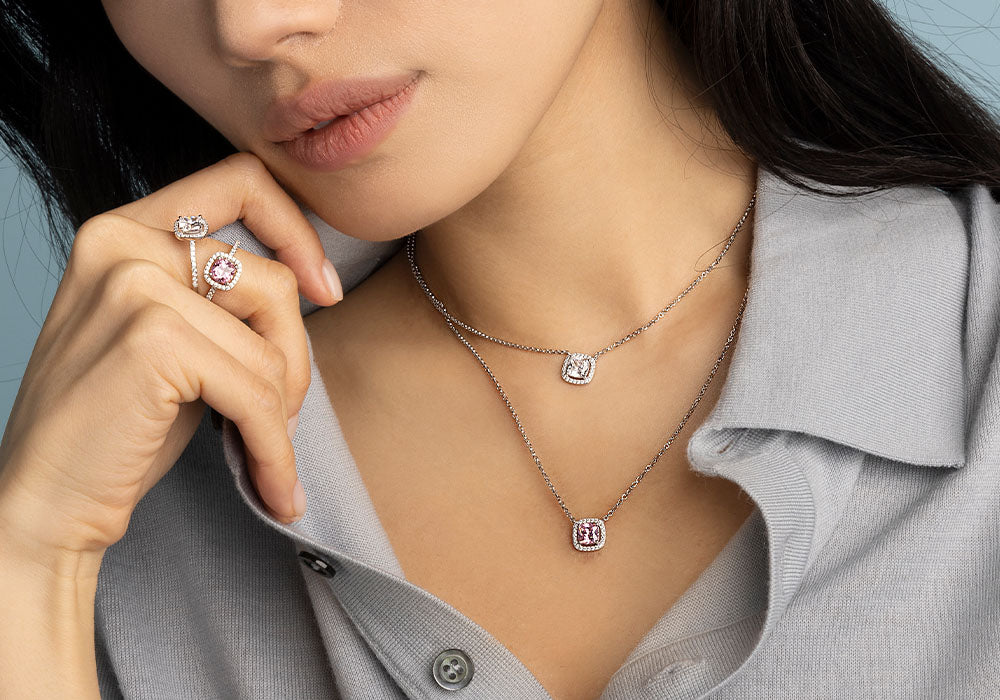 Geometric necklace design on a white backgroundNecklace and earrings with geometric pattern worn by a model
