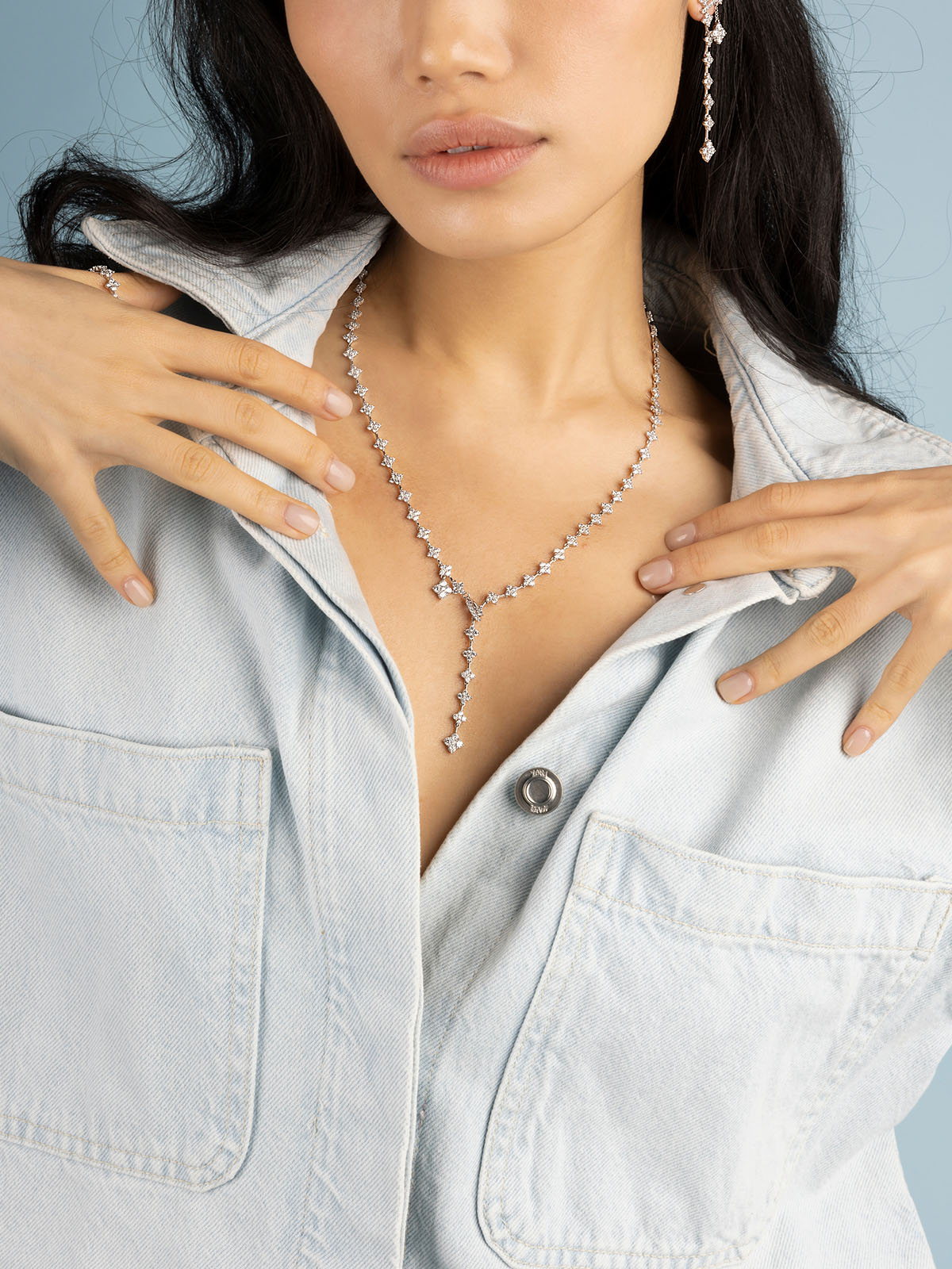 Necklaces APM Monaco white gold-tone Y-drop adjustable necklace with linked four-petal flower motifs and a drop pendant.APM MONACO y drop spark adjustable necklace in silver worn on model