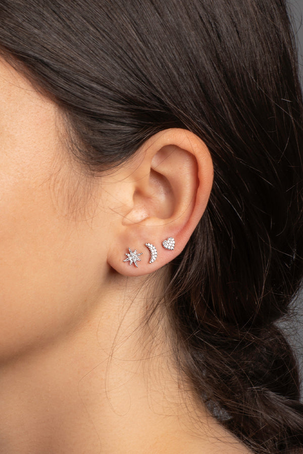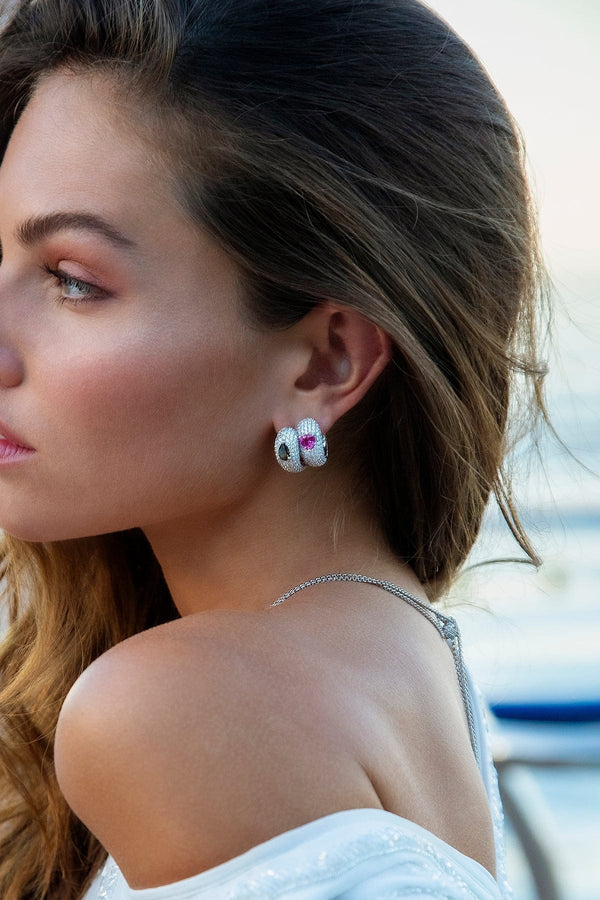 Earrings APM Monaco white stones-studded semi-circular huggie hoops.Close-up of an ear wearing APM MONACO silver hoop earring with a blurred background