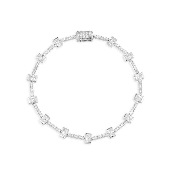 Rings APM Monaco pavé ring with square-cut white diamonds set along a white metal band.Rings APM Monaco – white pavé ring with clear crystals in a silver-tone finish, worn on a hand with other rings.