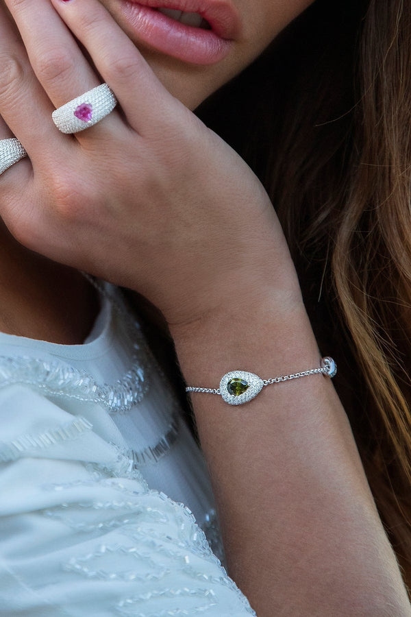 Bracelets APM Monaco. pastel-green stones set in a silver pavé bracelet.APM MONACO pastel green spark bracelet worn on model's hand