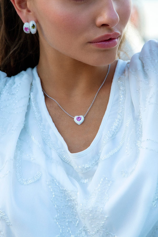 Silver necklace with a green stone pendant on a white backgroundNecklace with a green pendant worn by a person against a neutral background