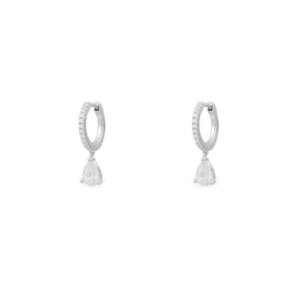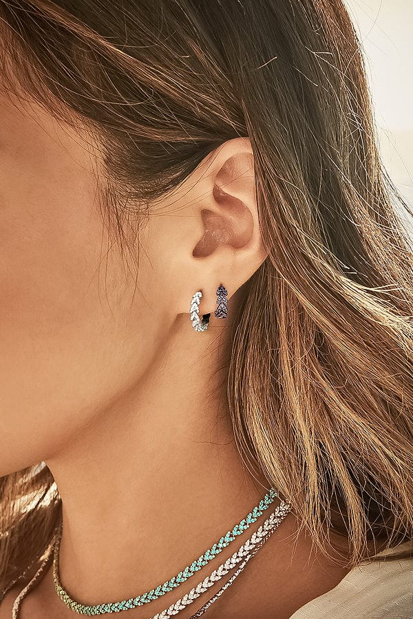 Earrings APM Monaco. Pair of white-silver huggie hoops with diamond-shaped white pavé stones.Close-up of a person wearing spark huggie silver earring from APM MONACO with a neutral background
