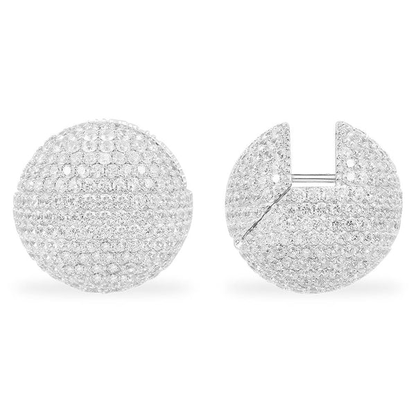 Earrings APM Monaco pavé hoop earrings in white silver-tone metal with clear stones.Close-up of a person wearing silver hoop earrings from APM MONACO with a neutral background
