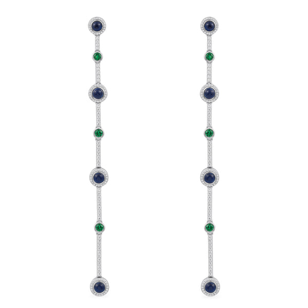Pair of earrings with green and blue stones on a white backgroundClose-up of a woman wearing a pair of earrings with green and blue gemstones.