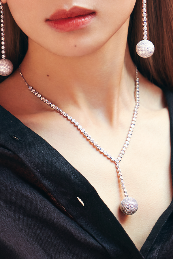 Necklaces APM Monaco adjustable spark necklace with a silver chain and White cubic zirconia pendant.APM MONACO spark adjustable necklace in silver worn on model