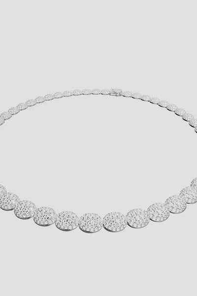 Ce collier, méticuleusement serti de dizaines de pierres, s'inspire des flocons de neige fraîchement tombés et leurs reflets de lumière.