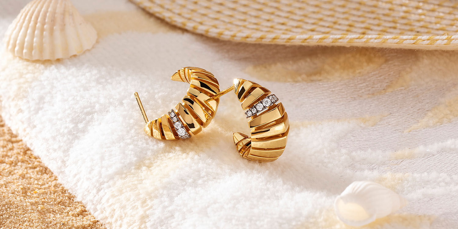 Earrings APM Monaco: yellow gold-plated diamond hoop earrings with horizontal line detailing.Earrings APM Monaco, yellow gold hoop with pavé white diamonds, sunray motif.