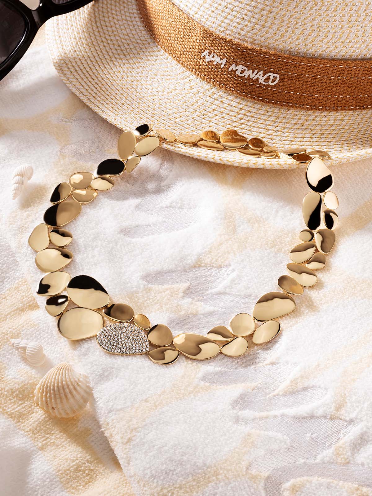 Necklaces APM Monaco: gold-tone pebble-link galet choker with pavé diamond detail.Necklaces and earrings APM Monaco: statement galet pebble design in silver-tone metal, each piece features a pebble accented with pavé clear crystals, giving a glittering, minimalist look.