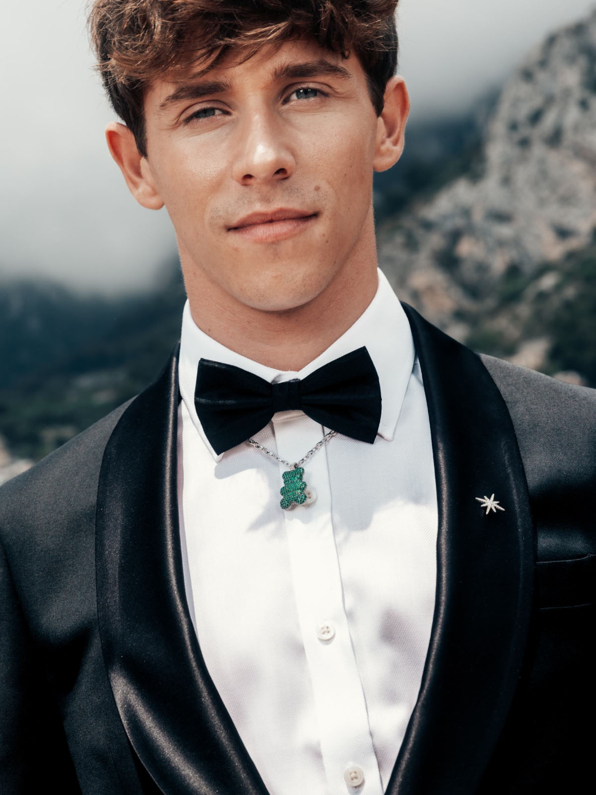 Necklaces APM Monaco: adjustable silver chain with a purple bear pendant encrusted with white stones, paired with a matching pendant featuring clear stones.APM MONACO Necklace with a YUMMY bear-shaped pendant worn by a person in an olive green jacket.