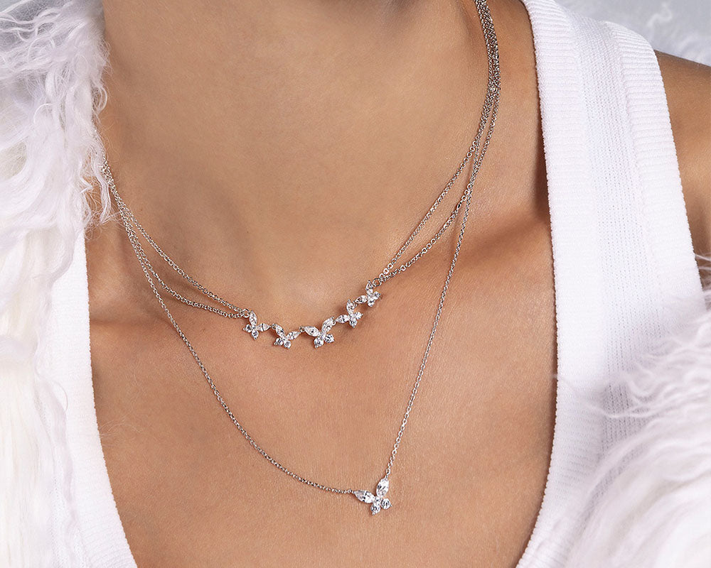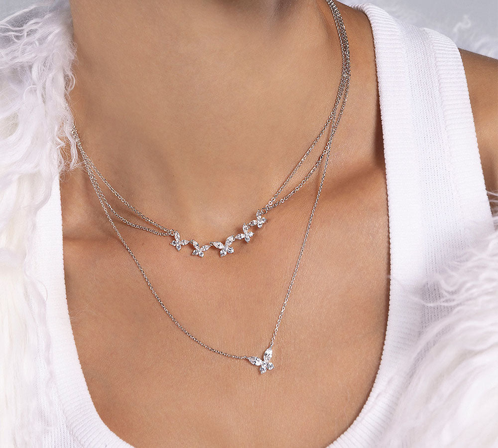 Necklaces APM Monaco. White gold butterfly necklace with white cubic zirconia on a silver chain; butterfly pendant and APM clasp.APM MONACO butterfly necklace in silver worn on model