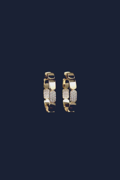 Questi orecchini realizzati con la lega alloy APM gialla e placcati in oro 18k sono microincastonati con zirconi bianchi.