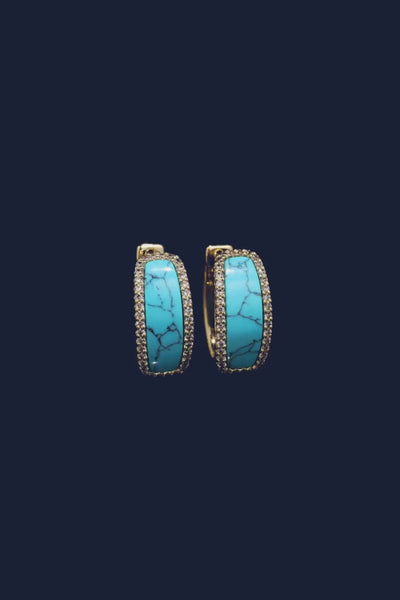 Questi orecchini sono realizzati con lega gialla APM e placcati in oro 18 carati. Sono microincastonati con zirconi bianchi e decorati con pietra color turchese.