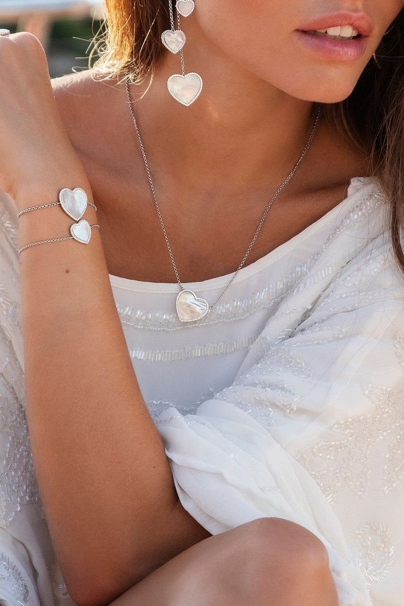 APM MONACO silver necklace with heart-shaped pendant on a white backgroundNecklace with a heart-shaped pendant from APM MONACO on a person and wearing a white feathered garment.
