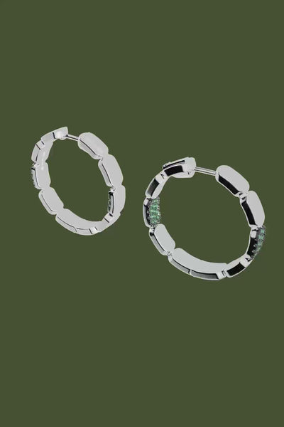 Promienne zielone kamienie elegancko uzupełniają projekt tych kolczyków, tworząc urzekający kontrast.