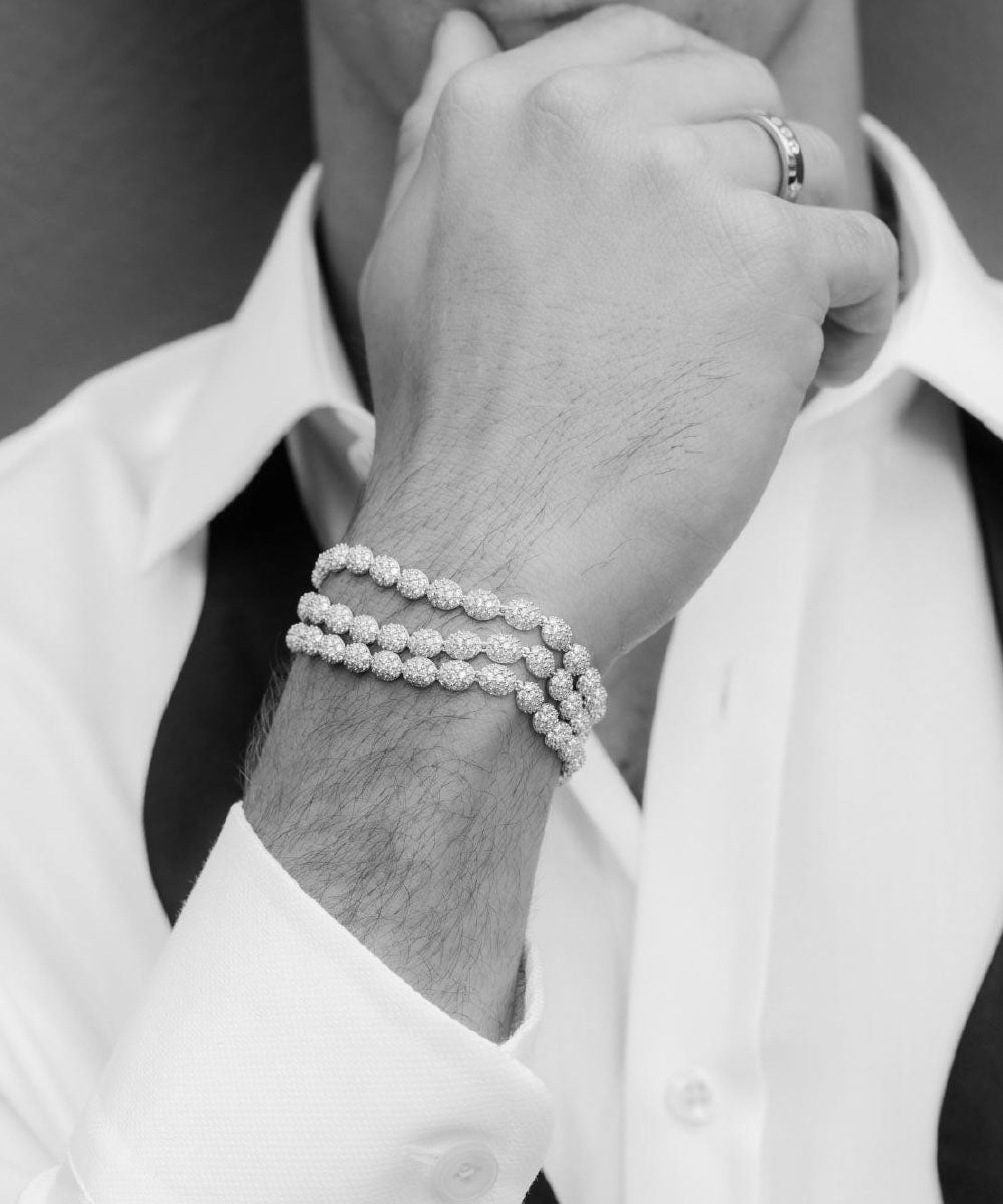 APM MONACO pave bracelet in silver with full small white stones on a light gray backgroundAPM MONACO silver bracelet on a person's wrist against a white background