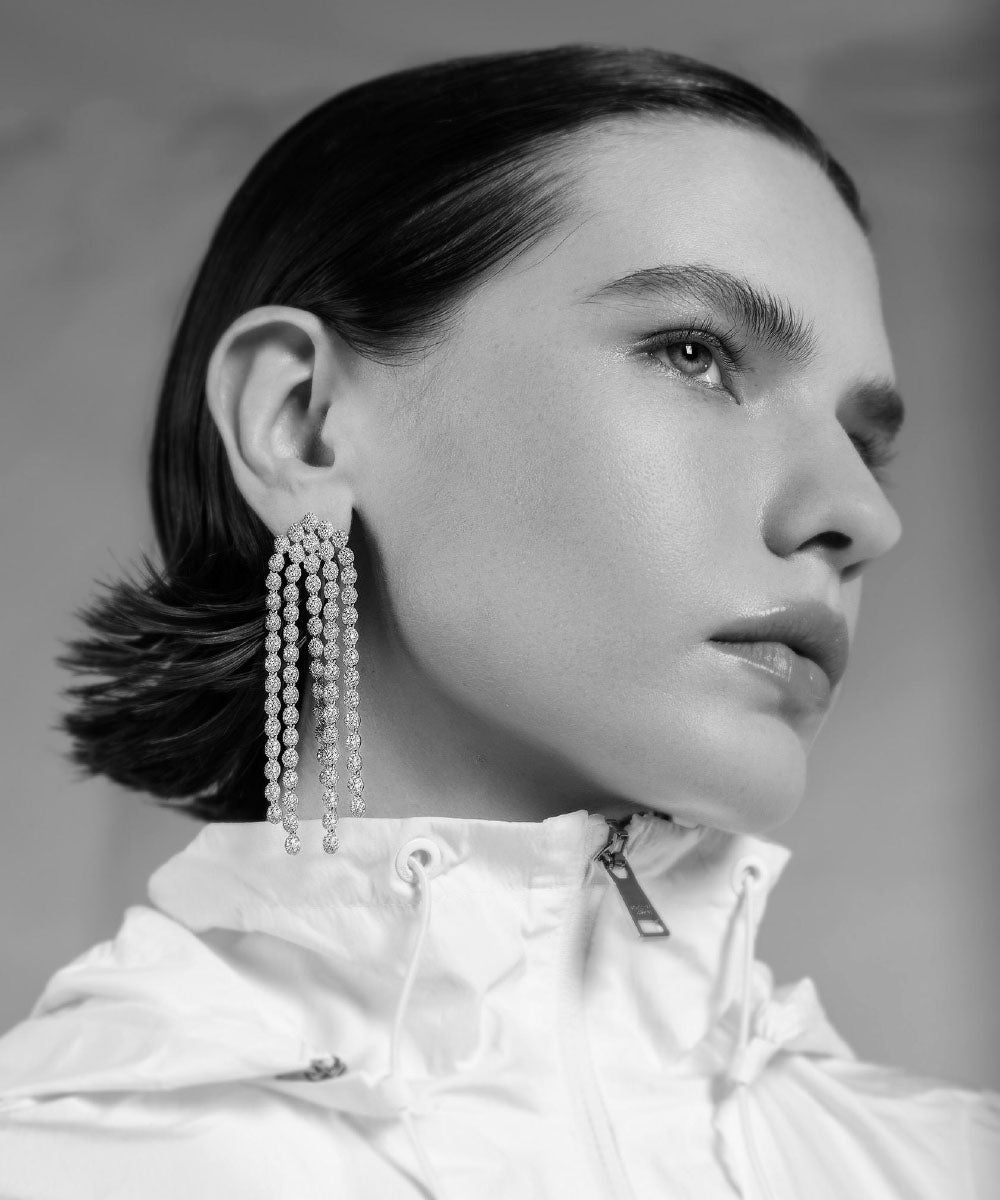 Pavé Cascade Earrings - APM MonacoClose-up of a woman wearing APM MONACO silver pave cascade earrings