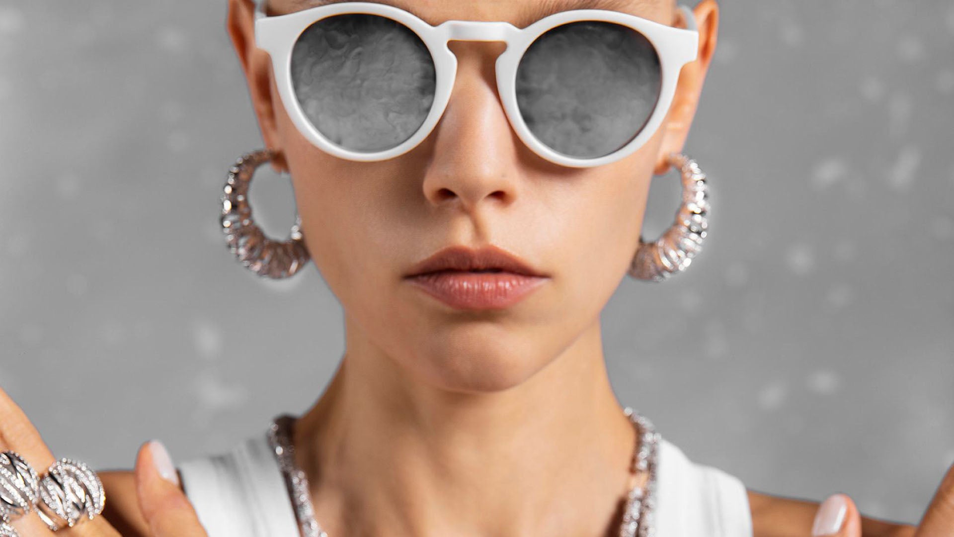 APM MONACO sunglasses with white frame and gray lenses on a white backgroundWoman in a white dress with APM MONACO sunglass against a gray background