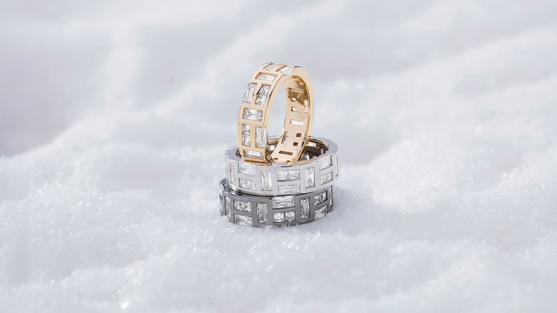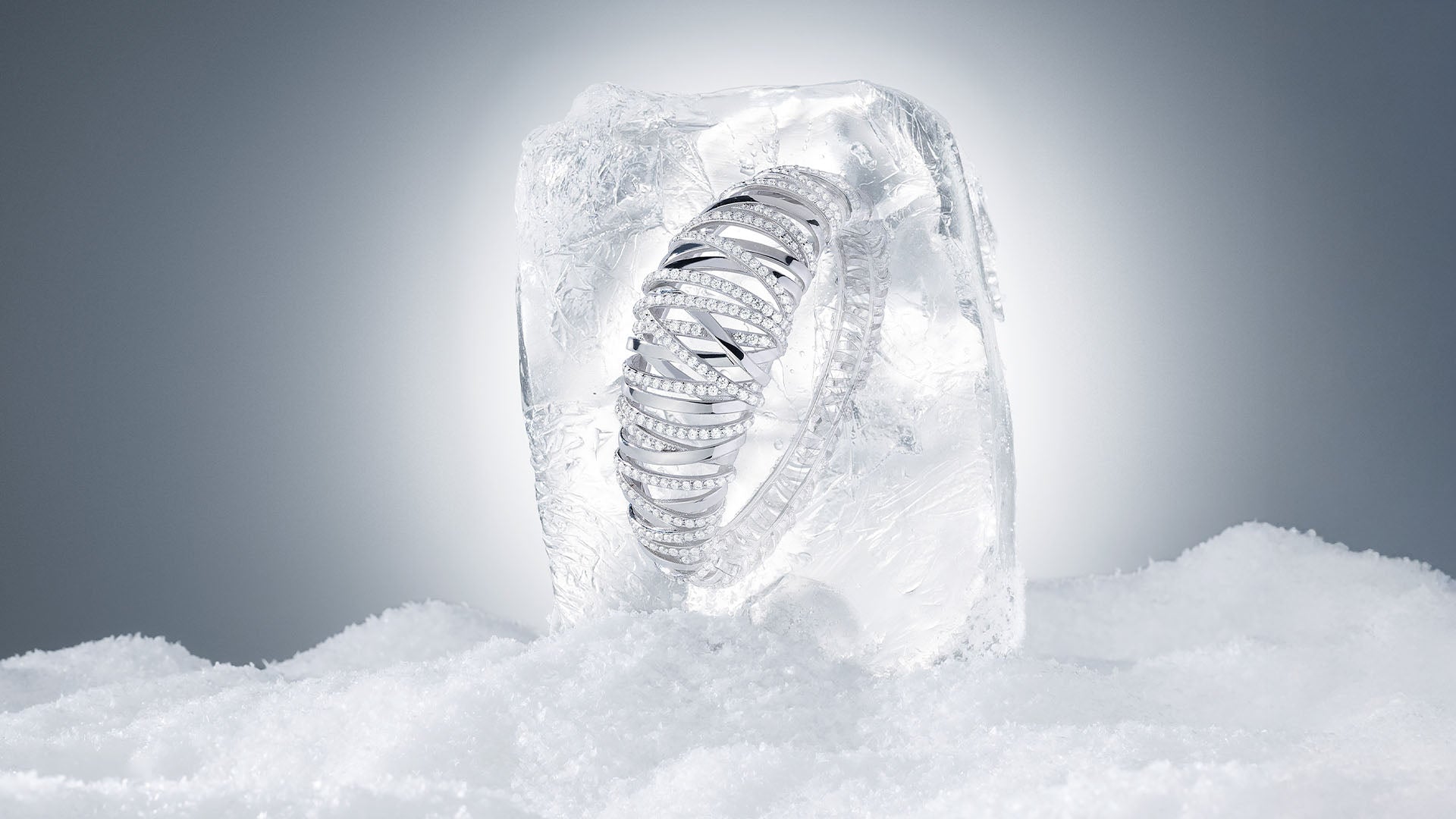 Ice Ring - APM MonacoHand wearing multiple APM MONACO labyrinth silver rings on a white background