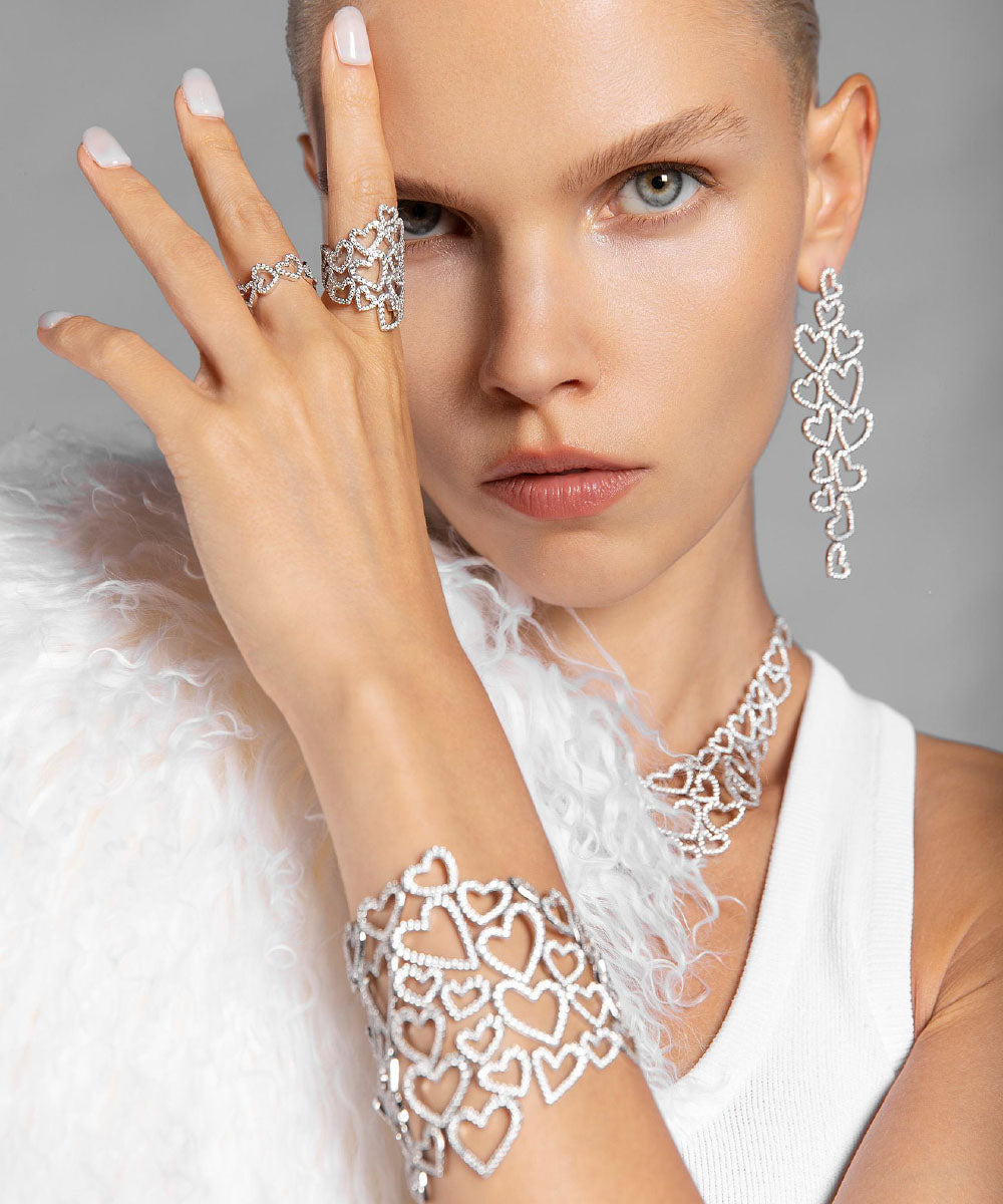 APM MONACO statement bracelet in silver with heart-shaped designs on a white backgroundAPM MONACO heart-shaped bracelet in silver on model's wrist against a white background
