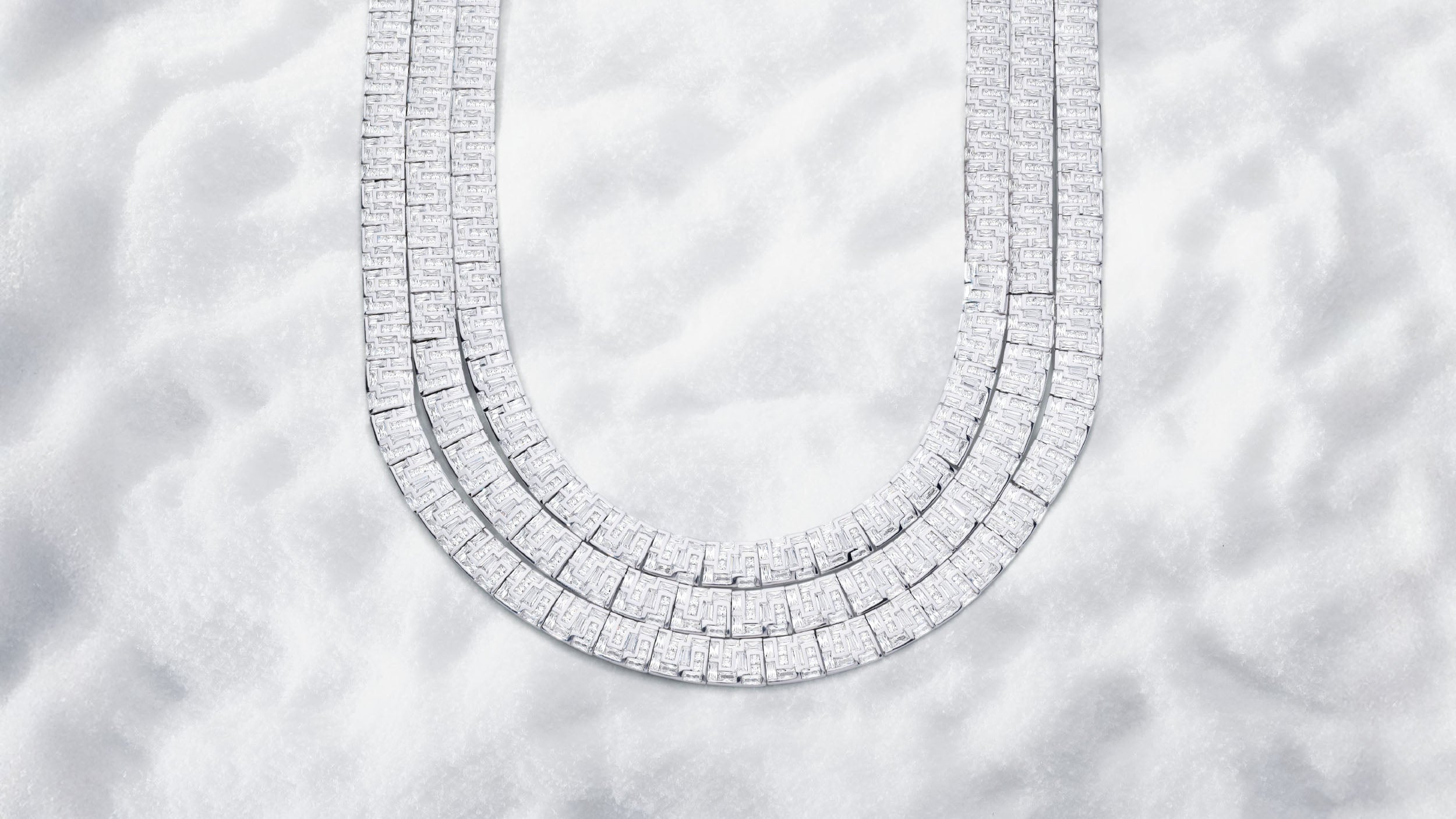 Silver necklace on a light gray backgroundNecklace on neck with a white feathered garment