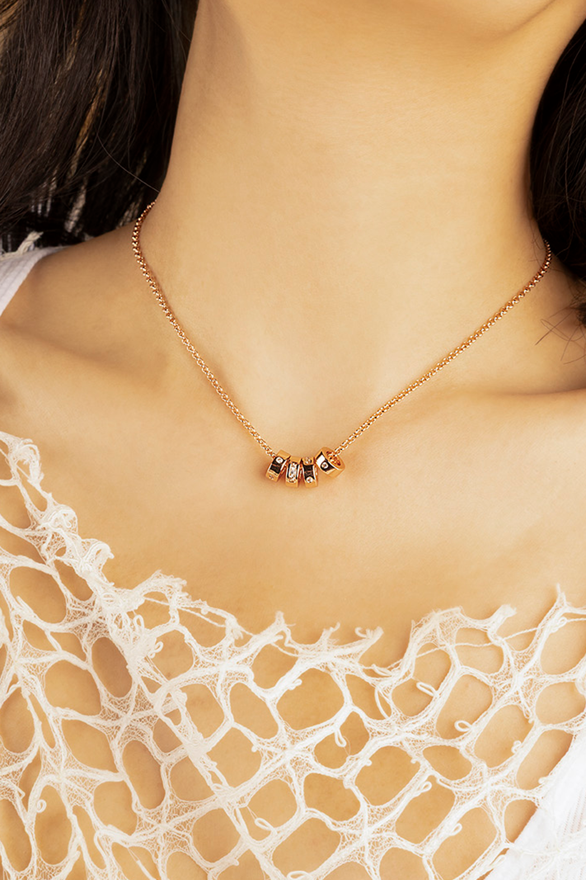Necklaces APM Monaco: Rose gold adjustable necklace with square charms, some encrusted with crystals, suspended from a delicate chain.Rose gold necklace with small beads on a model wearing a white fur coat.