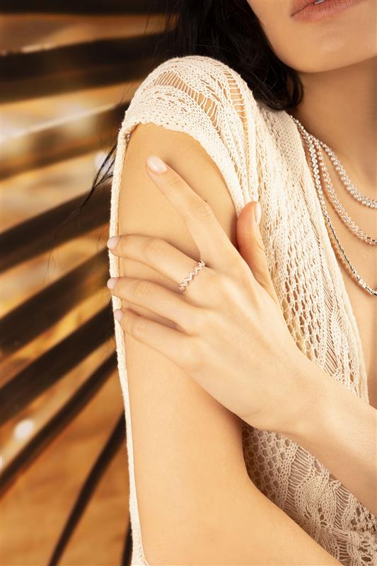 Rings APM Monaco: rose gold ring with a zigzag pavé pattern encrusted with clear stones.Close-up of a hand wearing a zirconia stones ring with a soft focus background