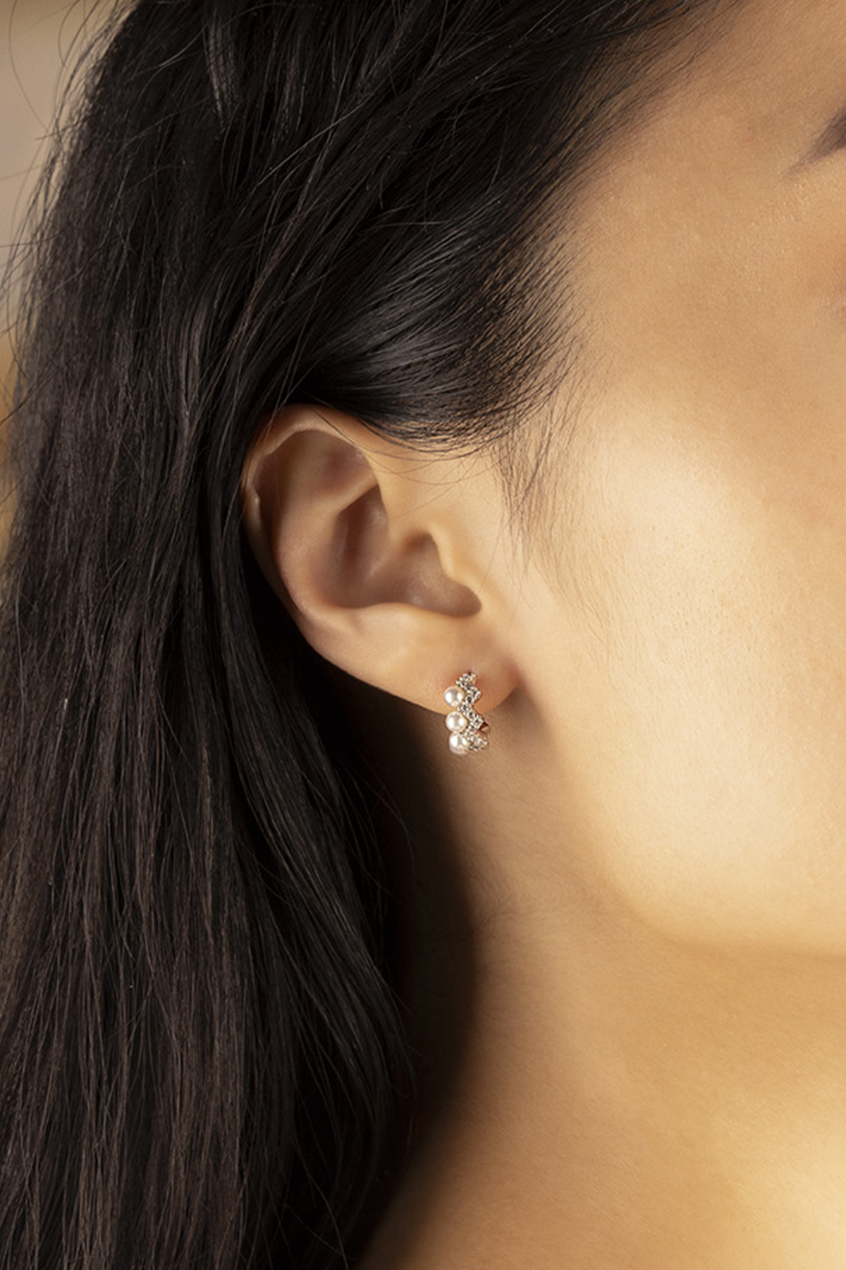 Earrings APM Monaco white-silver-toned huggie earrings with three inset diamonds each.Close-up of an ear wearing a small earring with a blurred background