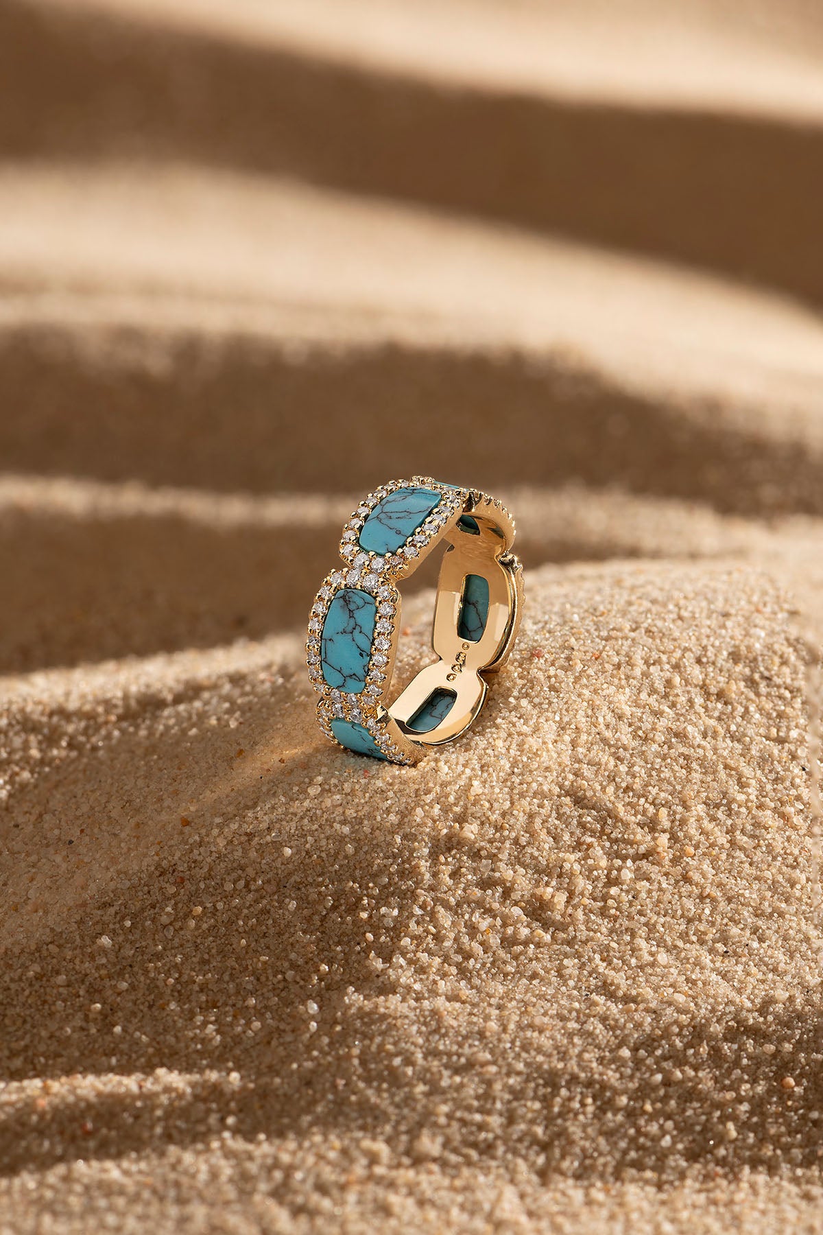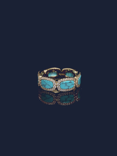 这款戒指采用APM合金制成,表面镀有18k金。微镶以白色合成立方氧化锆,细节点缀绿松石。